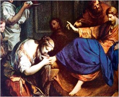 Ese día se hallaba Jesús en casa de Simón, el leproso al que había curado milagrosamente. Durante la cena una mujer hace su entrada en la casa, era María. La mítica mujer arroja un perfume sobre los pies de Jesús, luego los besa y seca con sus cabellos. Al ver esta escena, las personas de la casa se encolerizan con ella, diciendo que el perfume podría haber servido como mercancía para vender y beneficiar luego a los pobres. Sin embargo, ante el asombro general, el Señor defiende a María diciendo: "Esto ha sido como una preparación para mi entierro". El mito cristiano sostiene que es en este momento en el cual anuncia Jesús su muerte, causando un gran pesar entre sus discípulos.