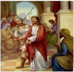 "Los soldados romanos llevaron a Jesús al patio del palacio y reunieron a toda la tropa en torno a él. Le quitaron sus vestidos y le pusieron una capa de soldado de color rojo. Después le colocaron en la cabeza una corona que habían trenzado con espinos y en la mano derecha le pusieron una caña. Doblaban la rodilla ante Jesús y se burlaban de él, diciendo: «¡Viva el rey de los judíos!» Le escupían en la cara, y con la caña le golpeaban en la cabeza. Cuando terminaron de burlarse de él, le quitaron la capa de soldado, le pusieron de nuevo sus ropas y lo llevaron a crucificar." (Mt 27, 27-31)